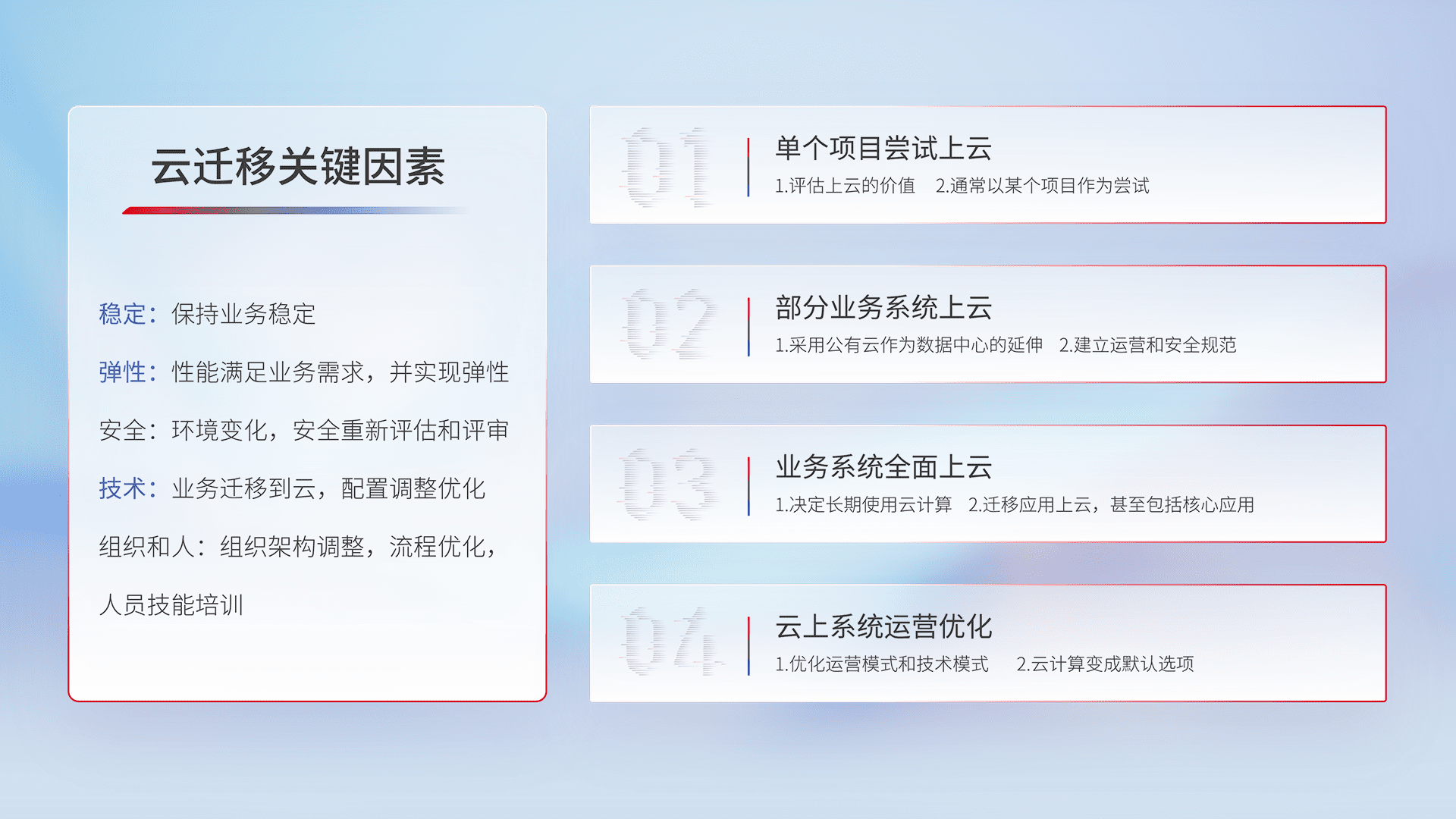结合实际业务,,,,从规划设计、、、、云平台选型、、云原生改造、、、、数据迁移、、、、集成交付,,迁移全过程为客户识别最佳上云路径,,,做好风险识别管理,,,设计网络架构、、身份权限、、、、安全审计合规、、、操作审计、、、、日志审计、、、、监控告警策略、、、多站点容灾设计等,,,,对云上基础设施进行整体规划,,提升IT治理水平,,,,以满足弹性、、、高可用、、高性能的需求。。。。