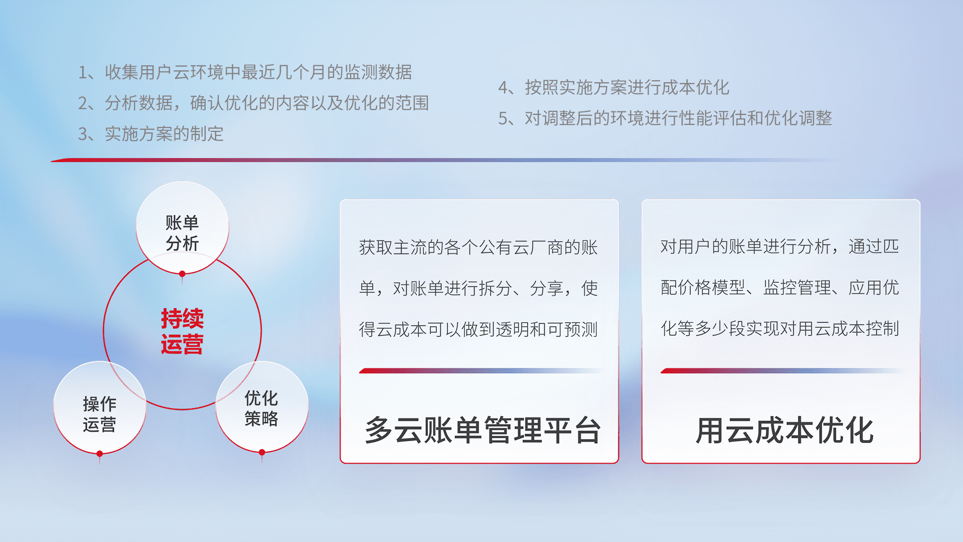 通过多云纳管,,,以统一的资源数据模型把客户的云资源进行抽象和封装,,进而实现对多云资源的统一操作,,,保障云资源管理的可靠性、、、、稳定性与可用性。。。量身定制化运维内容,,配置、、开发运维、、、、补丁管理、、备份、、、监控、、、认证和访问管理、、、审计和日常巡检等,,保障在用云过程中的可靠度,,,稳定度以及高可用率。。