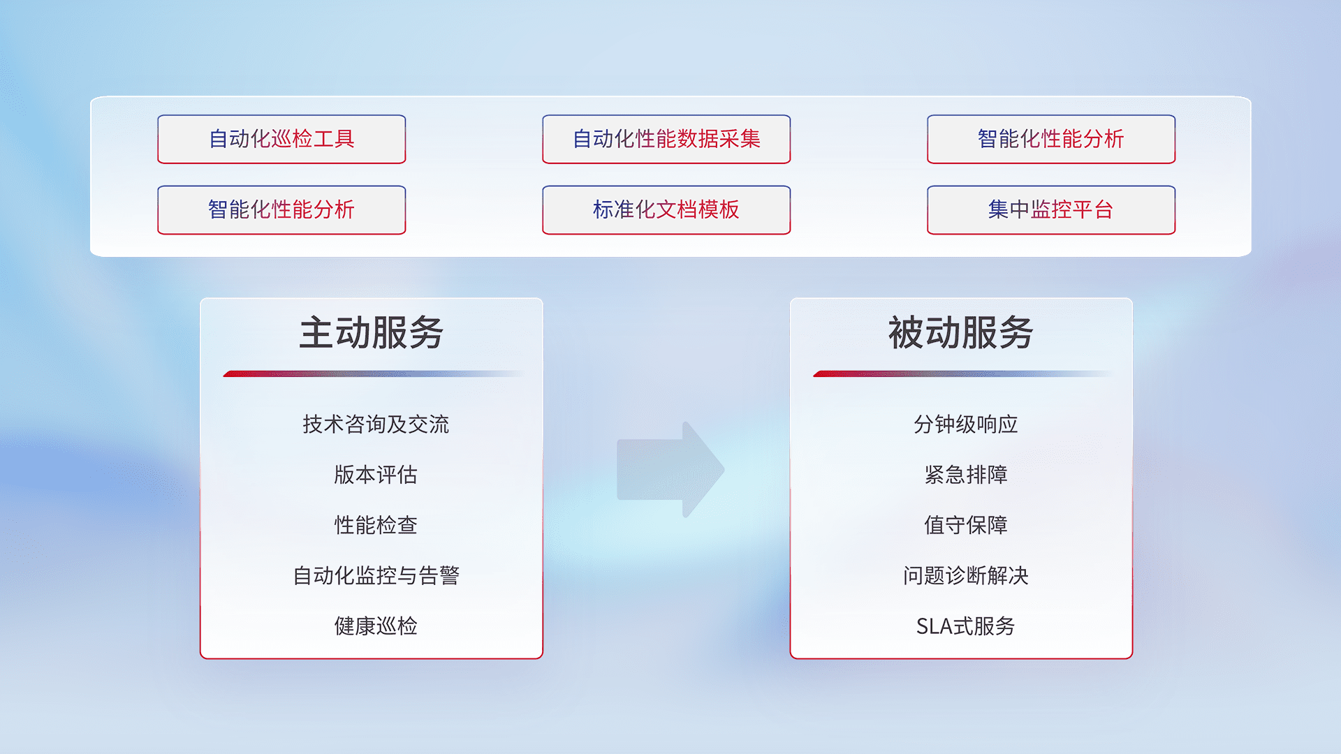 智能化工具和标准化文档,,,,保障服务质量,,,,提供主动服务(包含技术咨询、、、版本评估、、性能检查、、、、自动化监控与告警、、、健康巡检)和被动服务包含(分钟级响应、、紧急排障、、、、值守保障、、、问题诊断解决、、、、SLA服务)。。。